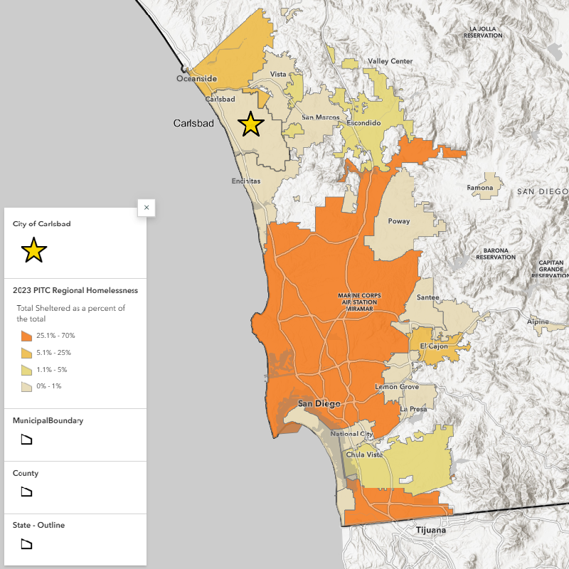 - While Carlsbad makes up approximately 3.5% of the region’s population, it has less than 1.8% of the region’s unsheltered population.